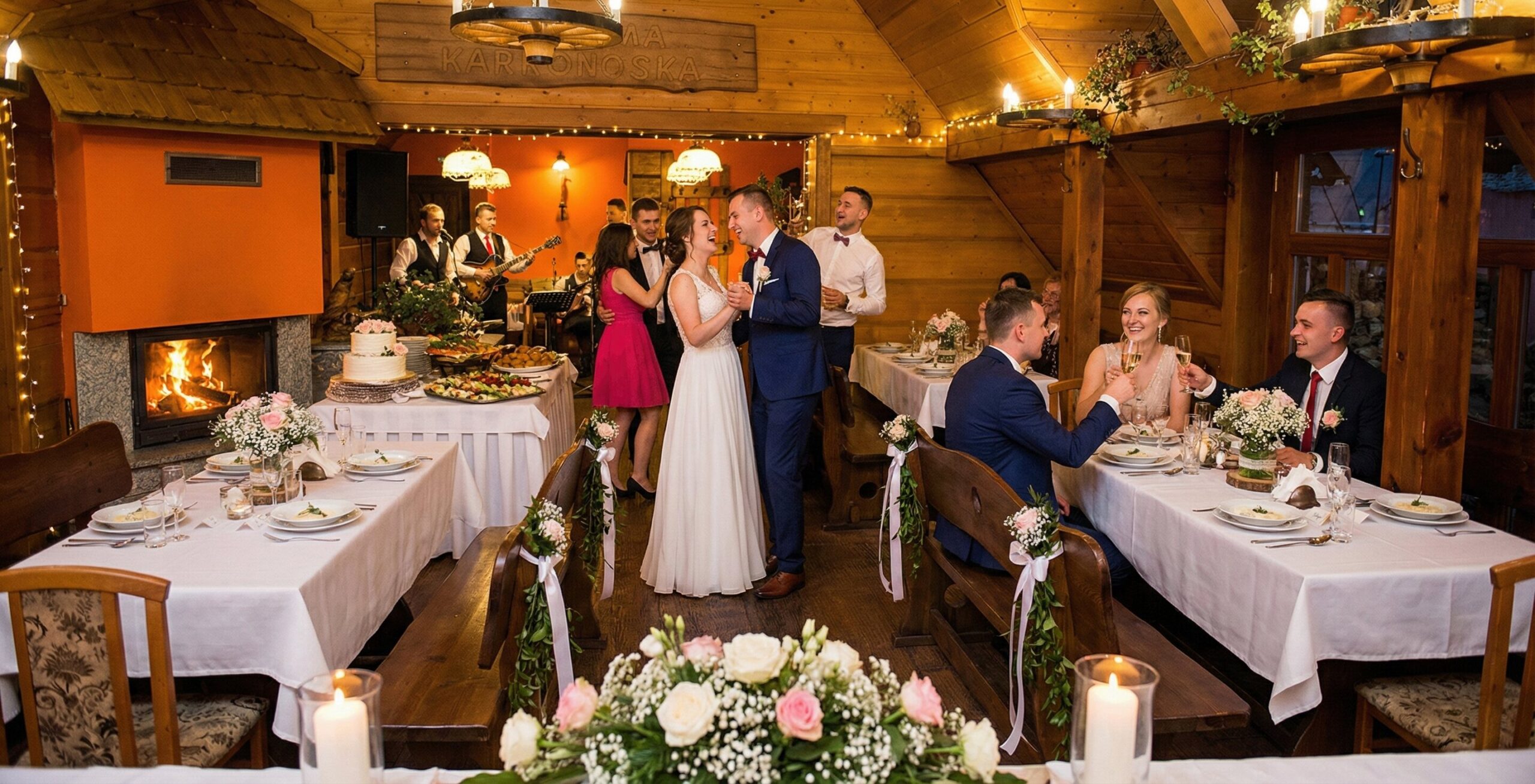 Marzycie o ślubie w góralskim klimacie? Czy to kameralny obiad dla najbliższych, czy huczne wesele do białego rana – nasze drewniane wnętrza i blask kominka stworzą magiczną, romantyczną oprawę dla Waszej miłości.
